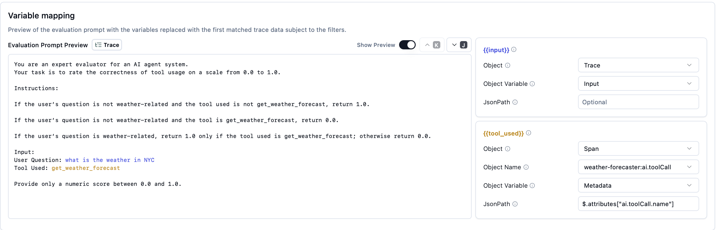 • {{tool_used}}Object: Span, Object Name: weather-forecaster.ai.toolCall, Object Variable: Metadata, JsonPath: $.attributes["ai.toolCall.name"]